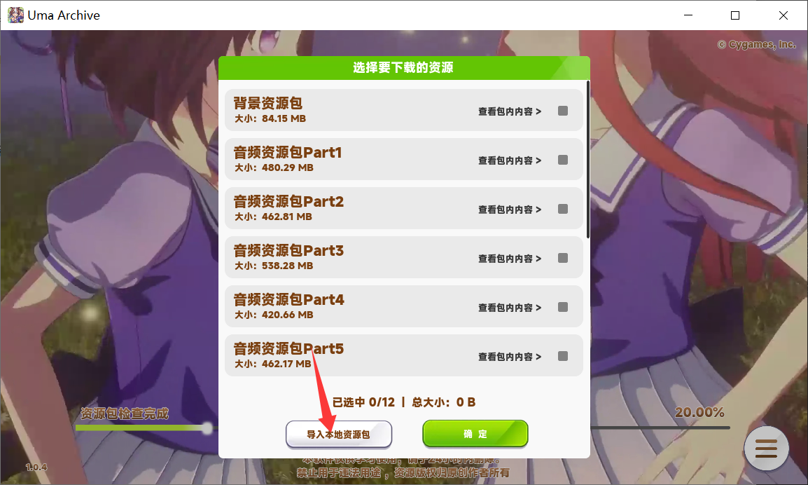 随后打开 UmaArchive ,在选择资源页面点击左下角的“导入本地资源包”。